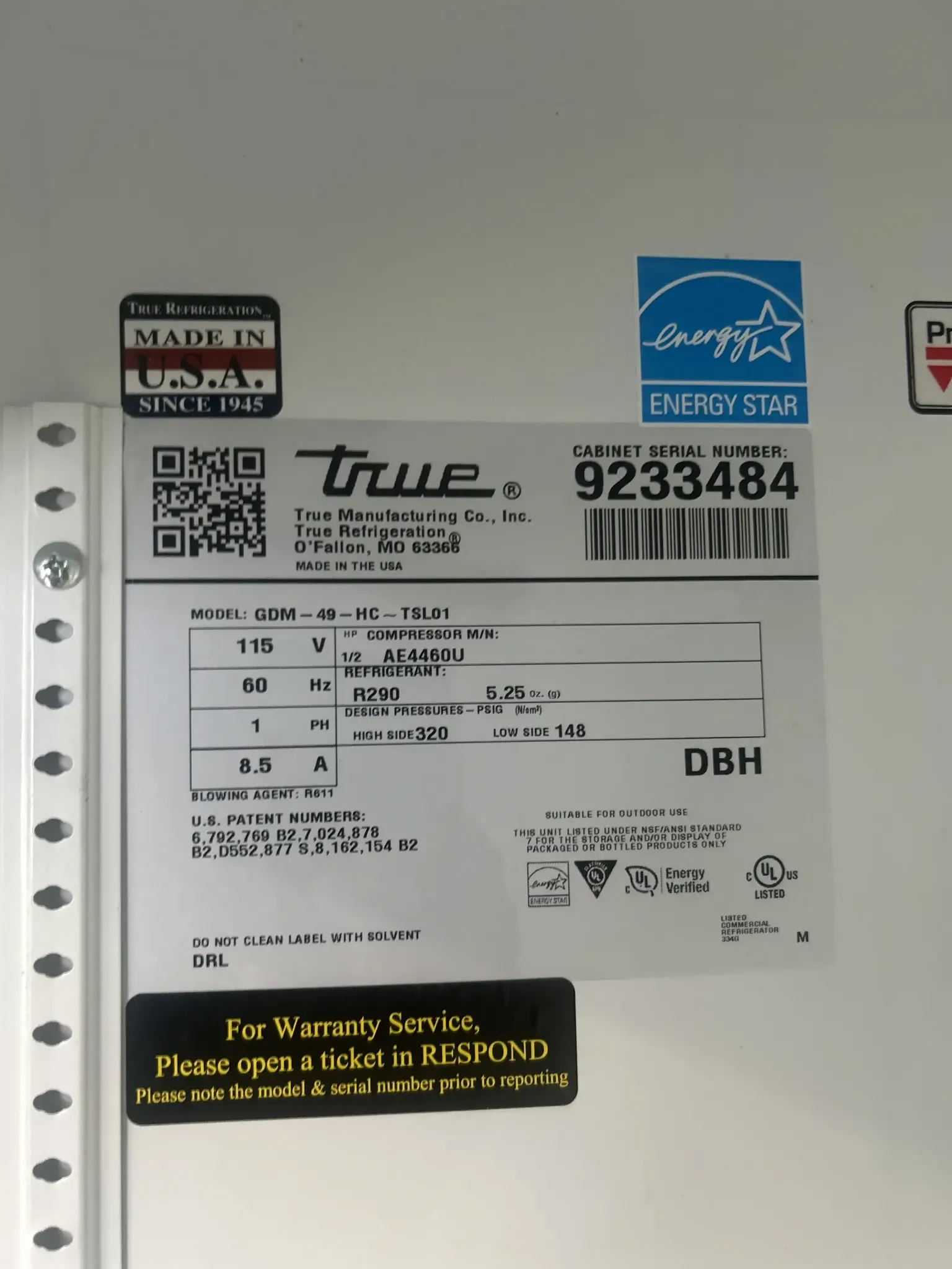 The True GDM-49-HC~TSL01 delivers superior refrigeration performance with eco-friendly R290 refrigerant and energy-efficient components. Featuring two crystal-clear glass swing doors, LED interior lighting, and a spacious design, this merchandiser keeps beverages and packaged goods perfectly chilled and attractively displayed for maximum sales impact.