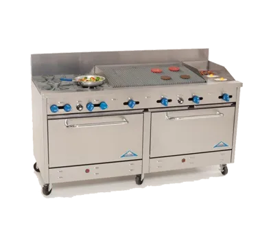 Create culinary masterpieces with precision tools. The Comstock-Castle 2F330-18-2.5RB Range is the perfect addition to any commercial restaurant kitchen. With its 72" width, this gas range provides ample space for cooking multiple dishes simultaneously. Equipped with four 24,000 BTU star burners and 12" square cast iron grates, this range ensures even heat distribution and excellent cooking performance. The 18" griddle with manual controls allows for precise temperature adjustments, while the 30" char-broiler with angle iron radiants adds a delicious smoky flavor to your dishes. The two extra-wide 31" ovens feature enamel bottom and door lining, providing durability and easy cleaning. With three rack positions and a rack included per oven, you can cook large quantities of food efficiently. The stainless steel exterior and 7" backguard not only enhance the range's durability but also give it a sleek and professional look. With a total BTU rating of 246,000, this range delivers exceptional cooking power. Trust Comstock-Castle to elevate your culinary creations to new heights.