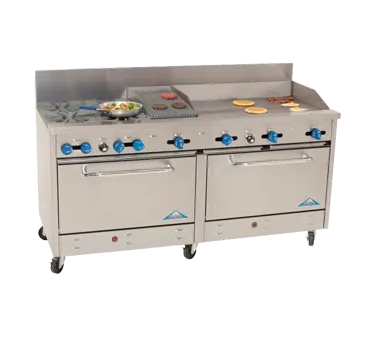 Crafting success in every culinary endeavor, the Comstock-Castle 2F330-36-1RB Range is a must-have for any commercial restaurant. With its impressive 72" width, this gas range offers ample cooking space to handle high-volume cooking demands. Equipped with four 24000 BTU star burners and 12" square cast iron grates, this range ensures even heat distribution and superior cooking performance. The 36" - 3/4" thick griddle with manual controls and the 12" char-broiler with angle iron radiants provide versatility for various cooking techniques. The two extra-wide 31" ovens feature enamel bottom and door lining, along with three rack positions, allowing for efficient baking and roasting. Made with a stainless steel exterior and a 7" backguard, this range is not only durable but also easy to clean. With a total BTU of 246000, this NSF and cETLus certified range is a reliable and efficient addition to any commercial kitchen.
