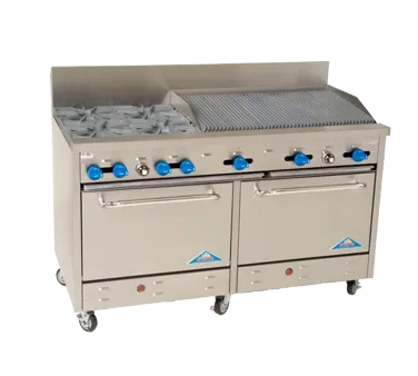 Premium cooking tools for exceptional results. Introducing the Comstock-Castle F3226-3RB Range, 60" Restaurant, Gas. This top-of-the-line range is designed to meet the demanding needs of commercial restaurants. With its four 24000 BTU star burners and 12" square cast iron grates, you can achieve precise and even heat distribution for perfect cooking every time. The 36" char-broiler with iron radiants adds versatility to your menu, allowing you to grill delicious steaks and burgers with ease. The two standard ovens feature enamel door and bottom linings, providing durability and easy cleaning. Each oven comes with a rack and three positions, allowing you to cook multiple dishes simultaneously. The stainless steel exterior and 7" high backguard not only give this range a sleek and professional look but also ensure durability and longevity. With a total of 183000 BTU, this range delivers exceptional cooking power. Trust Comstock-Castle for reliable and high-performance cooking equipment.