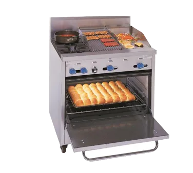Set the stage for culinary excellence with the Comstock-Castle F330-12-1RB Range. Designed for commercial restaurant use, this gas range is a powerhouse of performance and efficiency. With a width of 36 inches, it features two 24,000 BTU star burners with 12-inch square cast iron grates, ensuring even heat distribution and precise cooking. The range also includes a 12-inch griddle with manual controls and a 12-inch char-broiler with iron radiants, allowing for versatile cooking options. The standard oven, with enamel door and bottom linings, comes with a rack that offers three positions for optimal baking. The stainless steel exterior and 7-inch high backguard not only provide durability but also add a sleek and professional look to any kitchen. With a 123,000 BTU rating and NSF and cETLus certifications, this Comstock-Castle range is a reliable and high-performing choice for any commercial restaurant.