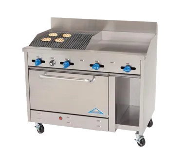 Innovate with versatile cooking solutions with the Comstock-Castle F3430-18-2.5RB Range, 48" Restaurant, Gas. This top-of-the-line range is designed to meet the demands of a busy commercial restaurant kitchen. With a 48" width, it offers ample cooking space for high-volume cooking. The range features a powerful 18" griddle with manual controls, perfect for preparing delicious breakfast items like pancakes and eggs. Additionally, it includes a 30" char-broiler with iron radiants, allowing you to achieve that perfect sear on steaks and burgers. The extra-wide 31" oven with enamel door and bottom linings provides consistent heat distribution for baking and roasting. The range also comes with a 10" wide cabinet base storage area, offering convenient storage for your cooking essentials. Made with a stainless steel exterior and 7" high backguard, this range is not only durable but also easy to clean. With a total of 146,000 BTU, this NSF and cETLus certified range is a reliable and efficient choice for any commercial restaurant.