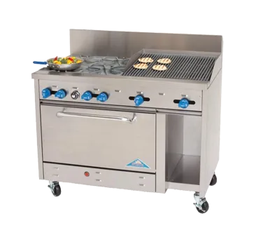 Elevate your culinary journey with top-notch tools. Introducing the Comstock-Castle F3430-1RB Range, a must-have for any commercial restaurant. This gas range is designed to meet the demands of a busy kitchen, offering exceptional performance and durability. With its six 24000 BTU star burners and 12" square cast iron grates, you can effortlessly cook multiple dishes at once, ensuring efficient and consistent results. The 12" char-broiler with iron radiants adds versatility to your menu, allowing you to create delicious grilled dishes with ease. The extra-wide 31" oven features enamel door and bottom linings, providing excellent heat retention and even baking. The stainless steel exterior and 7" high backguard not only enhance the range's durability but also make it easy to clean. With a total of 199000 BTU, this NSF and cETLus certified range is a reliable and efficient addition to any commercial kitchen. Upgrade your restaurant's cooking capabilities with the Comstock-Castle F3430-1RB Range.