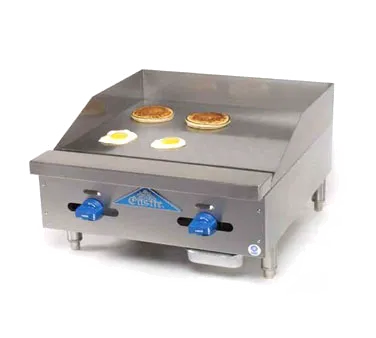 Craft culinary wonders with professional-grade gear. The Comstock-Castle FHP24-24 Gas Countertop Griddle is a must-have for any commercial restaurant. With its 24" x 21" highly polished steel griddle plate, this griddle provides a spacious and durable cooking surface. The two manual controls allow for precise temperature adjustments, ensuring perfect results every time. The 4" splash guard on the back and ends keeps your kitchen clean and safe, while the 3-1/2" wide front grease trough and removable grease drawer make cleaning a breeze. Made with a stainless steel exterior and equipped with 4" stainless steel legs, this griddle is built to withstand the demands of a busy kitchen. With a powerful 40,000 BTU, this NSF and ETL certified griddle delivers exceptional performance. Elevate your culinary creations with the Comstock-Castle FHP24-24 Gas Countertop Griddle.