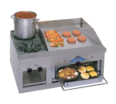 Set the culinary standard with top-tier equipment. Introducing the Comstock-Castle FHP36-24B Griddle / Hotplate, Gas, Countertop. This versatile and efficient unit is designed to meet the demands of a commercial restaurant kitchen. With its two 24,000 BTU star burners and cast iron grates, you can achieve precise and even heat distribution for perfect cooking results every time. The 24" x 21" x 3/4" thick griddle plate provides ample space for cooking a variety of dishes, while the pull-out lower cheesemelter rack adds versatility to your menu options. The stainless steel mesh radiant ensures quick and efficient heating, while the stainless steel exterior guarantees durability and easy cleaning. With three manual controls and a total of 78,000 BTU, this gas countertop unit offers exceptional cooking power. Upgrade your kitchen with the Comstock-Castle FHP36-24B and experience the difference in performance and quality.