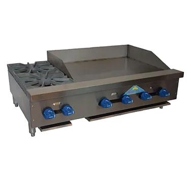Stay ahead in the ever-evolving culinary landscape with the Comstock-Castle FHP42-30 Griddle / Hotplate. Designed for commercial restaurant use, this countertop gas unit is a versatile addition to any kitchen. With its 42" wide x 28" deep frame, it offers ample cooking space to meet the demands of a busy establishment. Equipped with two 24,000 BTU star burners and cast iron grates, as well as a 30" wide x 21" deep x 3/4" thick griddle, this unit provides precise heat distribution and excellent cooking performance. The stainless steel exterior ensures durability and easy cleaning, while the 4" stainless steel legs provide stability. With six manual controls and a total of 120,000 BTU, this griddle/hotplate combination offers versatility and efficiency. NSF and ETL certified, this Comstock-Castle unit guarantees quality and safety. Upgrade your restaurant kitchen with the FHP42-30 and elevate your culinary creations.