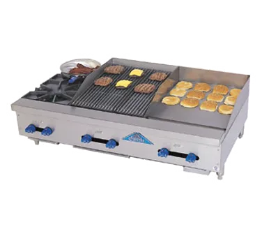 Stay ahead in the dynamic culinary landscape with Comstock-Castle's FHP48-18-2.5LB Griddle / Charbroiler. This versatile countertop gas unit is designed to meet the demands of commercial restaurants. With a 48" wide x 28" deep frame, it offers ample cooking space for high-volume operations. The unit features a 30" x 21" cooktop broiler area with cast iron grates and a sloped or flat lava rock with cast iron bottom grates. Additionally, it includes an 18" x 21" x 3/4" thick griddle plate for added versatility. The stainless steel splash guards on three sides ensure a clean and safe cooking environment. With six manual controls and a powerful 116,000 BTU, this NSF and ETL certified unit delivers exceptional performance. Upgrade your restaurant's cooking capabilities with Comstock-Castle's FHP48-18-2.5LB Griddle / Charbroiler.