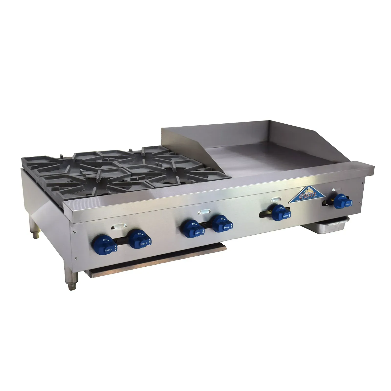 Stay competitive with innovative culinary solutions with the Comstock-Castle FHP48-24-2LB Griddle / Charbroiler. This countertop gas unit is designed to meet the demands of a busy commercial restaurant. With a 48" wide x 28" deep frame, it offers ample cooking space for high-volume operations. The unit features a 24" x 21" x 3/4" thick griddle plate, perfect for cooking a variety of dishes to perfection. The cast iron grates, sloped or flat, ensure even heat distribution and excellent searing capabilities. The lava rock with cast iron bottom grates adds a smoky flavor to your grilled items. Stainless steel splash guards on three sides keep your kitchen clean and safe. With 90,000 BTU of power and four manual controls, this NSF and ETL certified unit delivers exceptional performance. Upgrade your restaurant's cooking capabilities with the Comstock-Castle FHP48-24-2LB Griddle / Charbroiler.