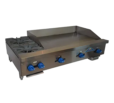 Introducing the Comstock-Castle FHP48-36T Griddle / Hotplate, Gas, Countertop. This versatile tool redefines the art of cooking in commercial restaurants. With its 48" wide x 28" deep frame, it offers ample space for preparing a variety of dishes simultaneously. Equipped with two 24000 BTU star burners and a 36" wide x 21" deep x 3/4" thick griddle plate, this unit delivers exceptional heat distribution and control. The 12" x 12" cast iron hotplate grates ensure even cooking and durability. Featuring three thermostatic griddle controls and two manual controls, you have precise command over the 108000 BTU power. The stainless steel exterior and 4" stainless steel legs guarantee durability and easy cleaning. NSF and ETL certified, this griddle/hotplate combination is a reliable addition to any commercial kitchen. Elevate your culinary creations with the Comstock-Castle FHP48-36T and experience the difference it makes in your restaurant's efficiency and quality.