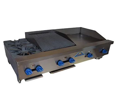 Invest in quality for an unparalleled cooking experience with the Comstock-Castle FHP54-24-1.5RB Griddle / Charbroiler. This countertop gas unit is designed specifically for commercial restaurant use, offering a combination of a char-broiler and griddle in one convenient package. With a 54" wide x 28" deep frame, this unit provides ample cooking space to handle high-volume demands. The two 24,000 BTU cast iron star pattern hotplate burners ensure even heat distribution and efficient cooking. The 24" x 21" x 3/4" thick griddle plate and 18" x 21" cooktop broil area offer versatility for various cooking techniques. The cast iron broiler grates, sloped or flat, and iron radiant enhance heat retention and provide excellent searing capabilities. Stainless steel splash guards on three sides and a stainless steel exterior ensure durability and easy cleaning. With manual controls and a total of 128,000 BTU, this NSF and ETL certified unit delivers exceptional performance for any commercial kitchen. Invest in the Comstock-Castle FHP54-24-1.5RB for superior cooking results and efficiency.