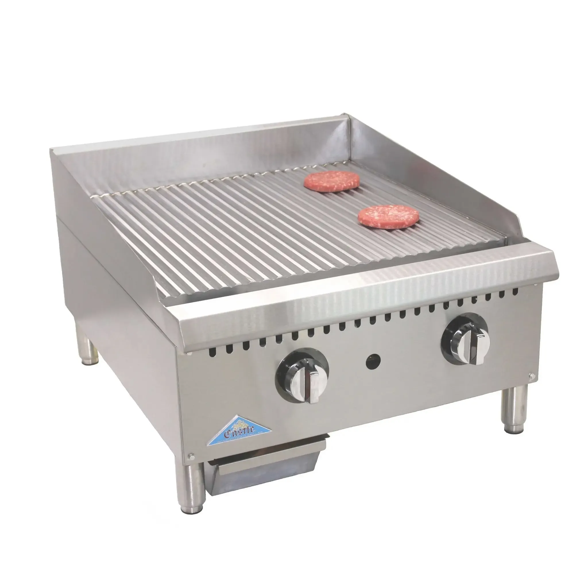 Transform your kitchen with top-of-the-line cooking solutions with the Comstock-Castle HG60T-1-FG Gas Countertop Griddle. Designed for commercial restaurant use, this griddle is a game-changer in the kitchen. With a spacious 60" wide x 30" deep frame, it provides ample cooking space to handle high-volume orders effortlessly. The fully grooved highly polished steel griddle plate ensures even heat distribution for consistent cooking results. Equipped with five thermostat controls, you have precise temperature control for different dishes simultaneously. The 4" splash guard on the back and ends keeps your kitchen clean and safe, while the 3" wide front grease trough and removable grease drawer make cleaning a breeze. Made with a stainless steel exterior and 4" stainless steel legs, this griddle is built to withstand the demands of a busy commercial kitchen. With a powerful 150,000 BTU, NSF certification, and ETL-Sanitation approval, the Comstock-Castle HG60T-1-FG Gas Countertop Griddle is the perfect addition to any commercial restaurant kitchen.