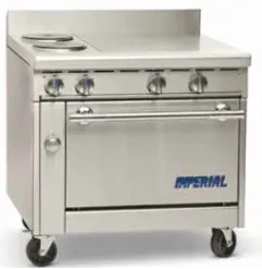 Introducing the Imperial, IHR-4-1HT-E, Range, 36" Heavy Duty, Electric. Craft culinary wonders with this top-of-the-line range that is designed to meet the demands of a commercial restaurant kitchen. With its heavy-duty construction and powerful performance, this range is a chef's dream come true. The IHR-4-1HT-E features four round elements and a 12" hot top, providing versatile cooking options to suit any recipe. The standard oven comes with a chrome rack and a removable crumb tray for easy cleaning. The porcelain oven interior ensures even heat distribution for perfect results every time. Made with a stainless steel front, sides, backguard, landing ledge, and kick plate, this range is not only durable but also adds a sleek and professional look to your kitchen. The adjustable feet and 6" legs allow for easy installation and customization. Trust Imperial to deliver exceptional quality and performance for your restaurant kitchen.