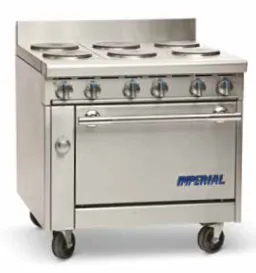 Experience kitchen innovation with the Imperial IHR-6-E Range, a heavy-duty electric range designed to meet the demands of a commercial restaurant. This 36" range features six round elements and a solid top, providing versatile cooking options for any culinary creation. The range also includes a standard oven with a chrome rack, allowing for efficient baking and roasting. With infinite heat controls, you have precise control over the cooking temperature, ensuring consistent and delicious results every time. The porcelain oven interior is easy to clean, saving you valuable time in a busy kitchen. Made with a stainless steel front, sides, backguard, landing ledge, and kick plate, this range is built to withstand the rigors of a commercial kitchen. The adjustable feet and 6" legs provide stability and flexibility in any kitchen layout. Trust the Imperial IHR-6-E Range to deliver exceptional performance and durability in your restaurant kitchen.