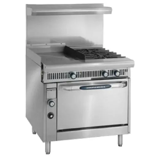 Unleash your inner chef with the Imperial, IHR-G24-2-XB Range. This Diamond Series Heavy Duty Range is designed to meet the demands of a commercial restaurant kitchen. With its 36" size, it provides ample cooking space for busy kitchens. The range features two open burners and a 24" griddle, allowing you to cook a variety of dishes simultaneously. The cast iron grates ensure even heat distribution and durability. The open cabinet base with a bottom shelf provides convenient storage for your cooking utensils and ingredients. The manual controls give you precise control over the cooking process. The stainless steel construction of the front, sides, landing ledge, backguard, and kick plate ensures durability and easy cleaning. With a powerful 130,000 BTU, this range delivers exceptional cooking performance. Upgrade your restaurant kitchen with the Imperial, IHR-G24-2-XB Range and experience professional-grade cooking at its finest.