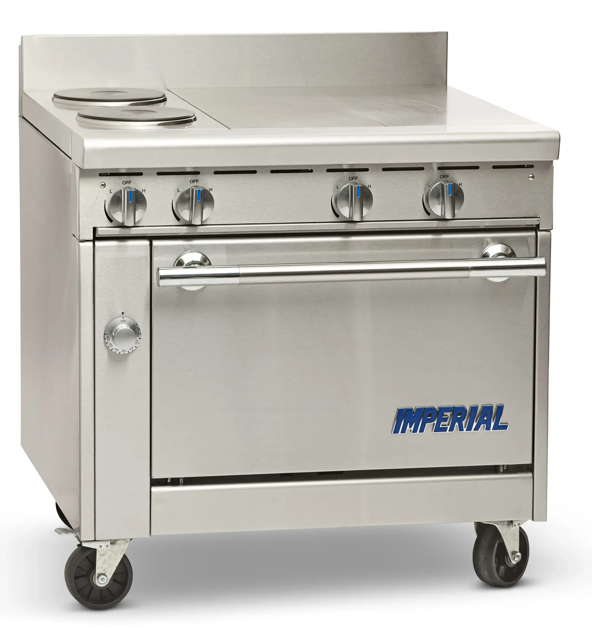Realize kitchen dreams with the Imperial, IHR-GT24-2-E-C Range, 36" Heavy Duty, Electric. This heavy-duty range is designed to meet the demands of a commercial restaurant kitchen. With its two round elements and a 24" thermostatic griddle, you can easily cook a variety of dishes simultaneously. The convection oven comes with three chrome racks, allowing you to bake multiple items at once. The 4" grease trough, removable grease can, and crumb tray make cleaning up a breeze. The porcelain oven interior ensures even heat distribution for perfect cooking results every time. Made with a stainless steel front, sides, backguard, landing ledge, and kick plate, this range is not only durable but also adds a sleek and professional look to your kitchen. The adjustable feet and 6" legs provide stability and flexibility. Trust Imperial to deliver high-quality and reliable kitchen equipment for your restaurant.