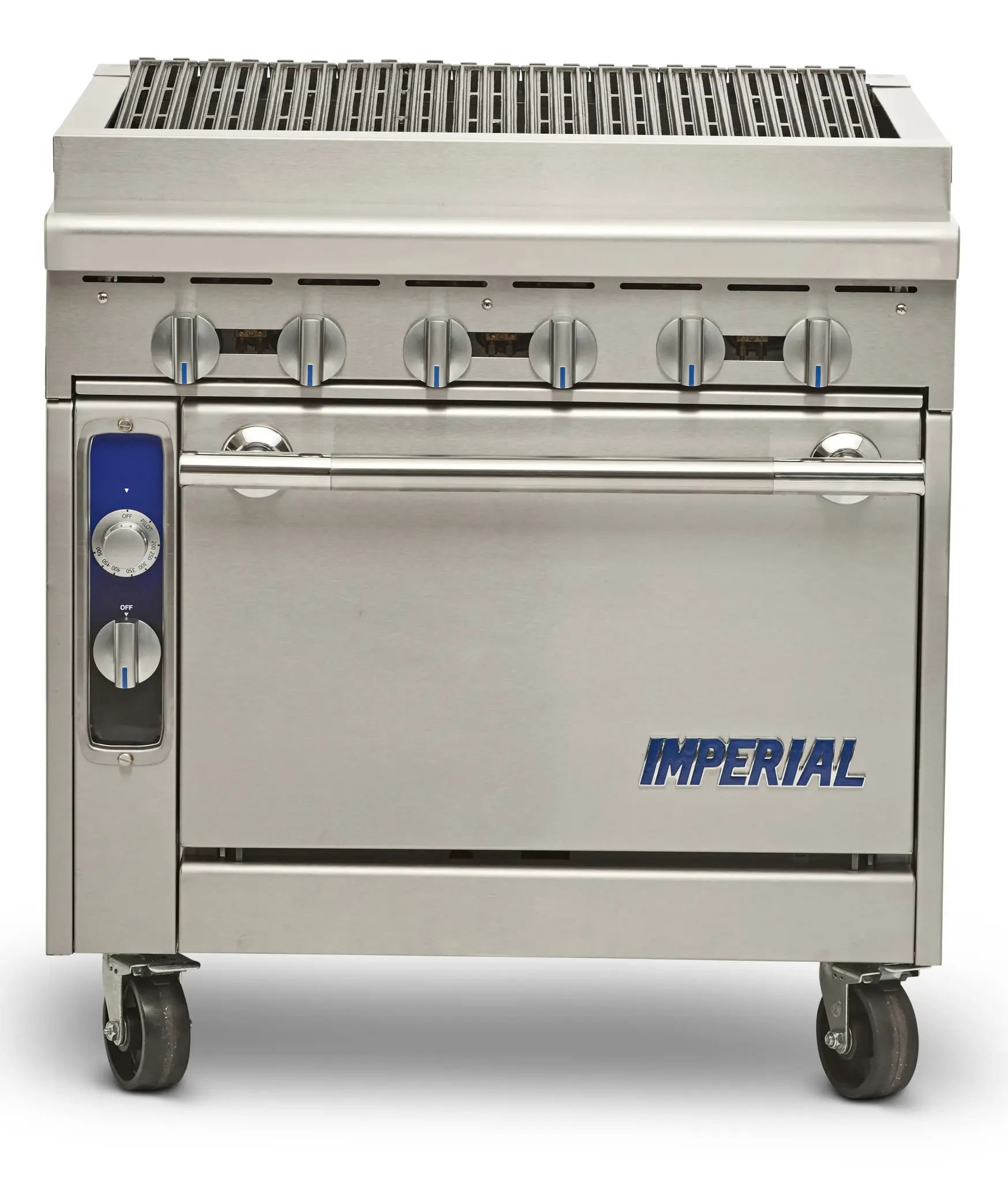 Introducing the Imperial IHR-RB Range, a heavy-duty gas range designed to deliver food perfection in commercial restaurant settings. With its diamond series construction, this range is built to withstand the demands of a busy kitchen. The 36" charbroiler features cast iron radiants and slanted cast iron top grates, ensuring even heat distribution and perfect grill marks on your meats and vegetables. The open cabinet base provides convenient storage for your cooking essentials, while the front grease gutter and removable crumb tray make cleaning a breeze. Made with stainless steel front, sides, landing ledge, stub back, and kick plate, this range is not only durable but also easy to maintain. The adjustable feet and 6" legs allow for easy installation and leveling. With a powerful 90000 BTU, this range is cETLus and NSF certified, guaranteeing safety and quality. Elevate your restaurant's cooking capabilities with the Imperial IHR-RB Range.