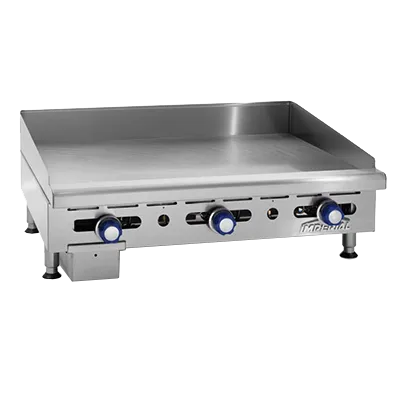Equip your commercial kitchen with the Imperial, IMGA-3628, Gas Countertop Griddle. This high-quality griddle is designed to meet the demands of a busy restaurant kitchen. With a 36" wide by 24" deep cooking surface, it provides ample space to cook a variety of dishes simultaneously. The 3/4" thick smooth polished steel plate ensures even heat distribution and excellent heat retention, resulting in perfectly cooked food every time. The manual controls allow for precise temperature adjustments, giving chefs full control over their cooking process. The 4" wide front grease trough and removable grease pan make cleaning up a breeze, while the stainless steel front, sides, splash guards, and ledge provide durability and a sleek appearance. With 90,000 BTU of power, this griddle can handle heavy-duty cooking tasks. Trust the Imperial, IMGA-3628, Gas Countertop Griddle to deliver exceptional performance and reliability in your commercial kitchen.