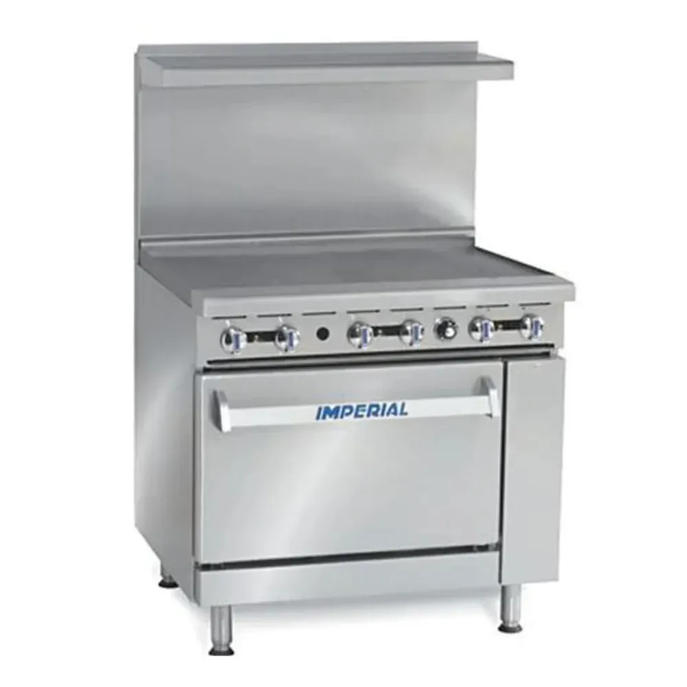 Cook with confidence and flair using the Imperial IR-2-G36T-E Range. This 48" electric restaurant range is designed to meet the demands of a busy commercial kitchen. With two round elements and a 36" thermostatic griddle, you have the versatility to cook a variety of dishes simultaneously. The two space saver ovens feature a chrome rack each, allowing you to bake or roast with ease. The porcelain oven interior ensures even heat distribution for perfect results every time. The stainless steel front, sides, backguard, landing ledge, and kick plate not only provide durability but also give your kitchen a sleek and professional look. The 4" grease trough, removable grease can, and crumb tray make cleaning up a breeze. With adjustable feet and 6" legs, you can easily customize the height to fit your needs. Trust in the quality and reliability of Imperial as you create culinary masterpieces in your restaurant.