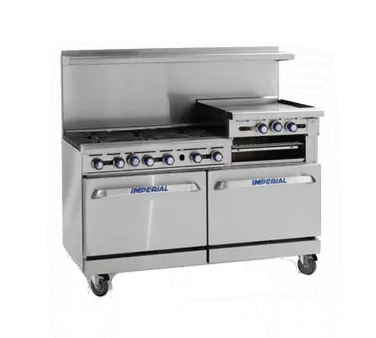 Enhance your commercial kitchen with the Imperial IR-4-G36-C Range. This 60" gas restaurant range is designed to meet the demands of a busy commercial kitchen. It features four open burners, allowing you to cook multiple dishes simultaneously. The 36" griddle provides a spacious cooking surface for preparing delicious breakfast items, burgers, and more. With one convection oven and one standard oven, you have plenty of baking and roasting capacity. The four chrome racks offer ample space for cooking multiple dishes at once. The stainless steel construction of the front, sides, backguard, shelf, landing ledge, and kick plate ensures durability and easy cleaning. The 3" grease trough, removable grease can, and crumb tray make maintenance a breeze. With 253,000 BTU of power, this range delivers exceptional performance. Trust the Imperial IR-4-G36-C Range to elevate your commercial kitchen's efficiency and productivity.