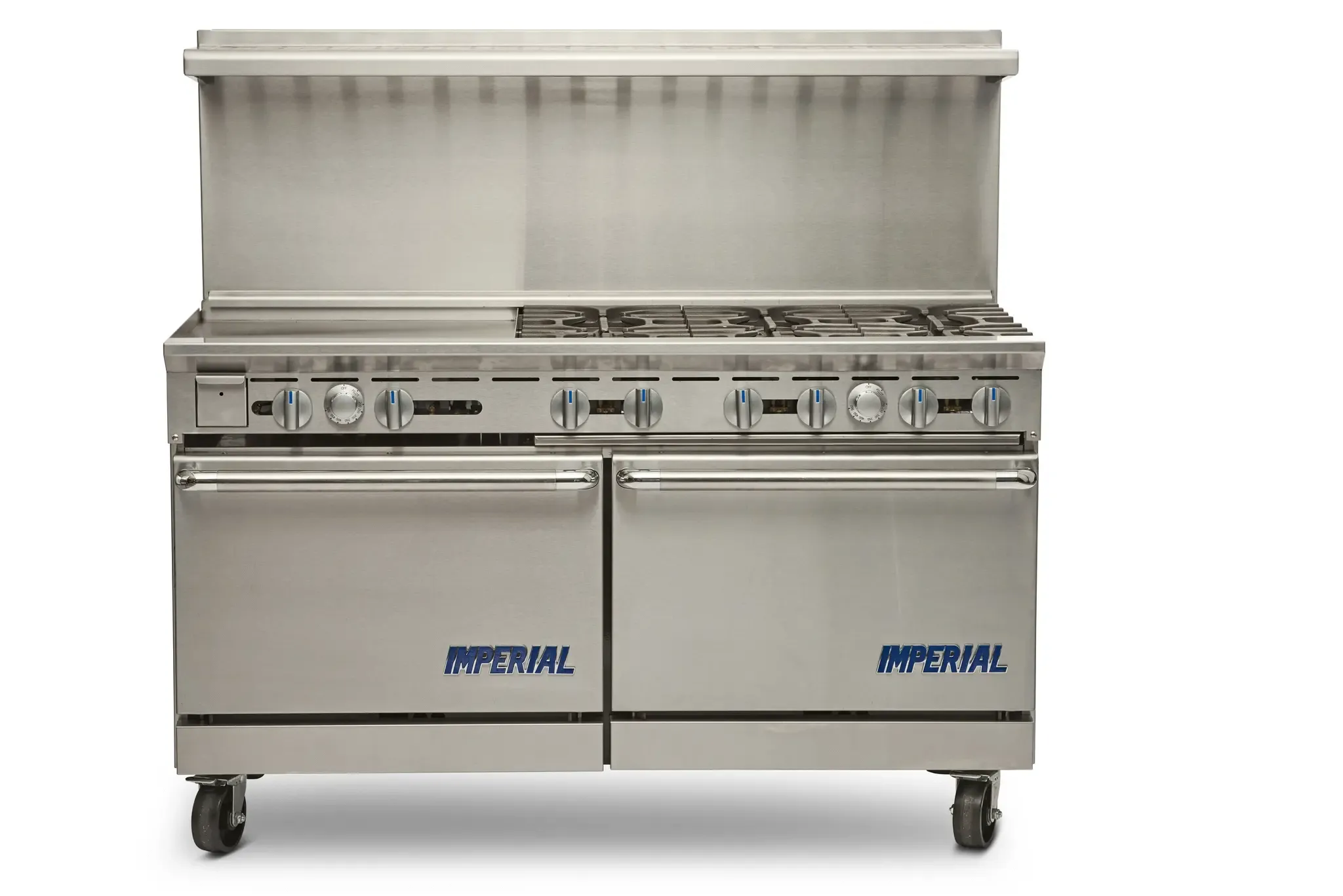 Equip your commercial kitchen with the Imperial IR-4-G36-CC Range, a powerful and versatile cooking solution designed for professional use. This restaurant range features four open burners and a 36" griddle, allowing you to simultaneously cook a variety of dishes with ease. The two convection ovens are equipped with three chrome racks each, providing ample space for baking and roasting. The 3" grease trough, removable grease can, and crumb tray make cleaning a breeze, ensuring a hygienic cooking environment. Made with stainless steel front, sides, backguard, shelf, landing ledge, and kick plate, this range is built to withstand the demands of a busy commercial kitchen. The adjustable feet and 6" legs provide stability and flexibility in installation. With a total of 248,000 BTU, this range delivers exceptional cooking performance. NSF, CE, CSA Flame, and CSA Star certified, the Imperial IR-4-G36-CC Range is a reliable and efficient choice for any commercial restaurant.
