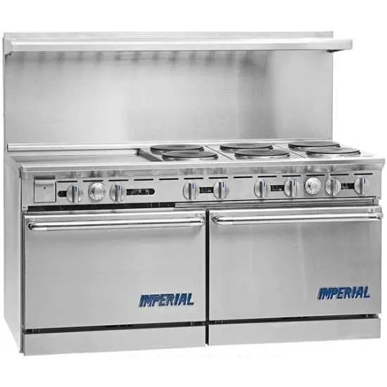 Fuel your restaurant's success with the Imperial IR-4-G48T-E-CC Range. This 72" electric restaurant range is designed to meet the demands of a busy commercial kitchen. It features four round elements, perfect for cooking a variety of dishes simultaneously. The 48" thermostatic griddle provides precise temperature control, ensuring consistent results every time. With two convection ovens, you can bake, roast, and broil with ease. Each oven comes with three chrome racks, offering plenty of space for multiple dishes. The infinite heat controls allow you to adjust the heat to suit your cooking needs. The porcelain oven interior is easy to clean, saving you time and effort. Made with a stainless steel front, sides, backguard, landing ledge, and kick plate, this range is built to withstand the rigors of a commercial kitchen. The adjustable feet and 6" legs provide stability and flexibility. With a 1/4 HP per oven, this range delivers powerful performance. Trust Imperial for reliable and efficient cooking equipment.