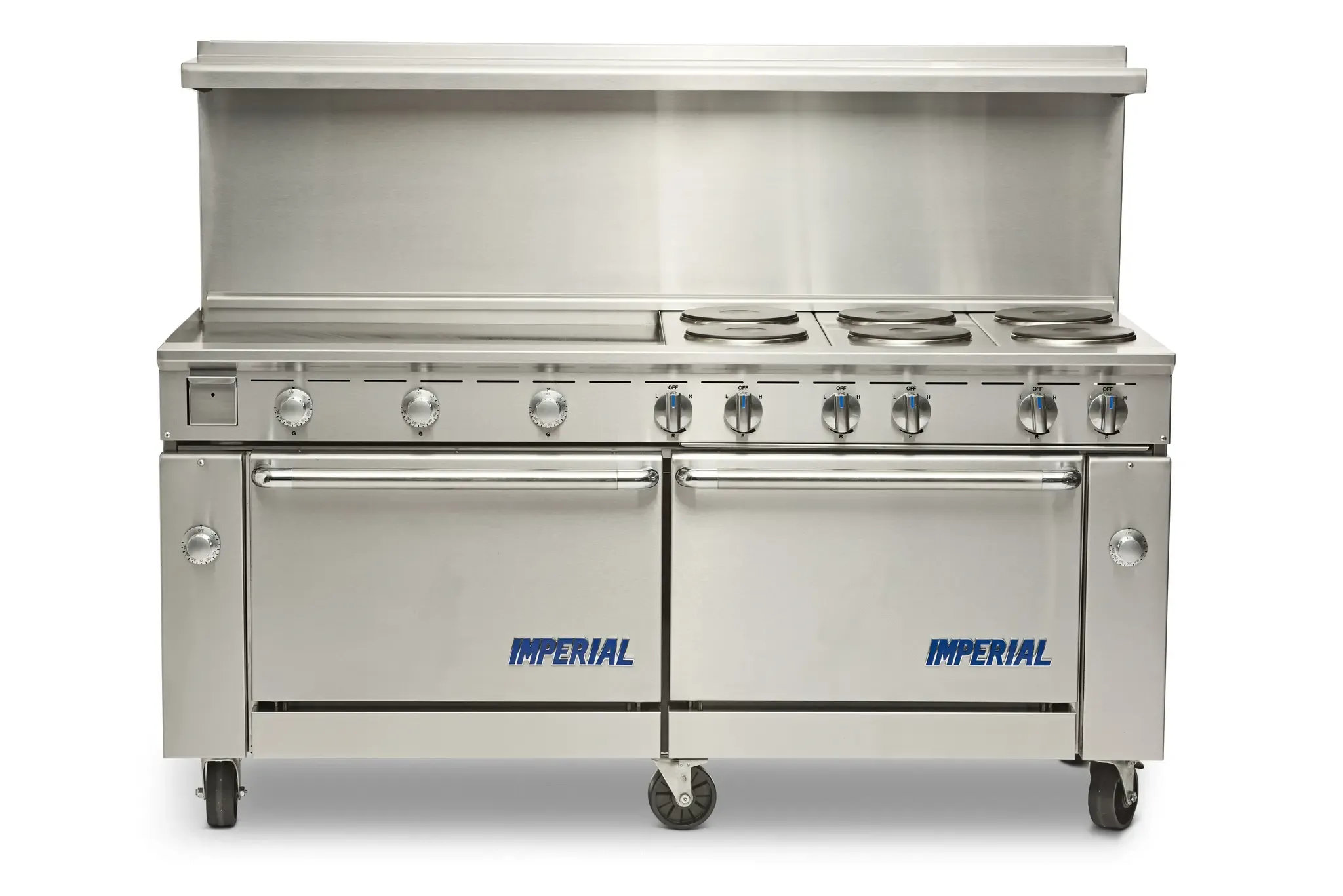Revolutionize your cooking setup with the Imperial IR-4-G48T-E Range, a game-changer for commercial restaurants. This electric restaurant range boasts a spacious 72" design, providing ample cooking space to meet the demands of a bustling kitchen. Equipped with four round elements and a 48" thermostatic griddle, this range offers versatility and precision for a wide range of culinary creations. The two standard ovens feature a chrome rack each, allowing for efficient baking and roasting. With infinite heat controls, you have complete control over the cooking process, ensuring consistent and delicious results every time. The porcelain oven interior is not only easy to clean but also enhances heat distribution for even cooking. Crafted with a stainless steel front, sides, backguard, landing ledge, and kick plate, this range is built to withstand the rigors of a commercial kitchen. The adjustable feet and 6" legs provide stability and flexibility in any kitchen layout. Trust in the cETLus, ETL-Sanitation, and CE certifications that guarantee the range's safety and quality. Upgrade your restaurant's cooking capabilities with the Imperial IR-4-G48T-E Range.