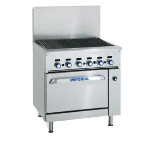 Empower your kitchen staff with the Imperial IR-48BR-220 Range. This 48" gas range is a perfect match for any restaurant series. It features a charbroiler with cast iron radiants and top grates, ensuring even heat distribution and excellent grilling results. The range also includes two space saver ovens, each equipped with a chrome rack for versatile cooking options. The stainless steel front, sides, and high backguard not only provide durability but also make cleaning a breeze. The grease trough and removable drip pan help maintain a clean and safe cooking environment. With 174,000 BTU of power, this range delivers exceptional performance for high-volume cooking. The adjustable feet and 6" legs ensure stability and flexibility in any kitchen setup. NSF and CSA certified, the Imperial IR-48BR-220 Range guarantees safety and reliability. Upgrade your restaurant kitchen with this top-of-the-line gas range.