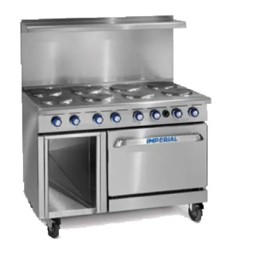 Elevate your cuisine with the Imperial IR-8-E Range, a top-of-the-line electric restaurant range designed to meet the demands of a busy commercial kitchen. With its 48" size, this range provides ample cooking space for your culinary creations. It features eight round elements that deliver consistent heat for precise cooking results. The two space saver ovens are perfect for baking, roasting, and keeping dishes warm. Each oven comes with a chrome rack and a porcelain interior for easy cleaning. The infinite heat controls allow you to adjust the temperature to suit your cooking needs. Made with a stainless steel front, sides, backguard, landing ledge, and kick plate, this range is not only durable but also adds a sleek and professional look to your kitchen. The 6" legs with adjustable feet ensure stability and convenience. Trust the Imperial IR-8-E Range to enhance your restaurant's efficiency and productivity.