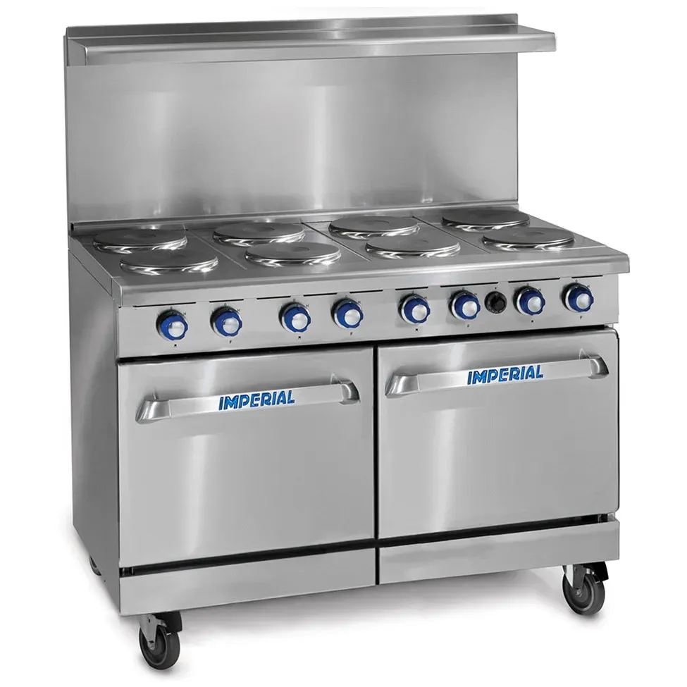 Invest in superior quality with the Imperial IR-8-G24T-E-CC Range, a must-have for any commercial restaurant. This electric restaurant range is designed to meet the demands of a busy kitchen, offering exceptional performance and durability. With its 72" size, it provides ample cooking space to handle high-volume cooking. The range features eight round elements, perfect for cooking multiple dishes simultaneously. It also includes a 24" thermostatic griddle, allowing you to cook delicious grilled items with precision. The two convection ovens are equipped with three chrome racks each, providing plenty of space for baking and roasting. The infinite heat controls give you precise temperature control, while the porcelain oven interior ensures easy cleaning. Made with stainless steel, this range is built to withstand the rigors of a commercial kitchen. With its exceptional features and quality construction, the Imperial IR-8-G24T-E-CC Range is a reliable and efficient choice for any restaurant.
