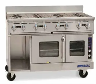 Unleash gastronomic brilliance with the Imperial IR-8 Range, a 48" gas restaurant range that is designed to elevate your culinary creations to new heights. This range features 8 open burners, allowing you to simultaneously cook multiple dishes with precision and efficiency. The 2 space saver ovens provide ample space for baking, roasting, and broiling, while the chrome rack in each oven ensures even heat distribution for perfectly cooked meals every time. The removable crumb tray makes cleaning a breeze, saving you valuable time in a busy restaurant kitchen. Crafted with a stainless steel front, sides, backguard, shelf, landing ledge, and kick plate, this range is not only durable but also adds a touch of elegance to your kitchen. With 6" legs and adjustable feet, you can easily customize the height to suit your needs. With a powerful 310,000 BTU, this NSF, CE, CSA Flame, and CSA Star certified range is a reliable and efficient addition to any commercial restaurant. Elevate your culinary game with the Imperial IR-8 Range.