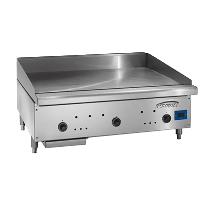Serve with pride with the Imperial ISCE-60 Gas Countertop Griddle. This high-quality griddle is designed to meet the demands of a busy commercial restaurant kitchen. With a spacious 60" W x 24" D cooking surface, you'll have plenty of room to cook multiple dishes at once. The 1" thick smooth steel plate ensures even heat distribution for consistent cooking results. The solid state thermostat allows for precise temperature control, while the 4" wide grease gutter and removable grease can make cleaning up a breeze. Made with durable stainless steel front, sides, ledge, and splash guards, this griddle is built to withstand the rigors of a commercial kitchen. The 4" legs provide stability and the 120000 BTU gas power ensures fast and efficient cooking. Trust in the Imperial ISCE-60 Gas Countertop Griddle to deliver exceptional performance and durability for your restaurant.