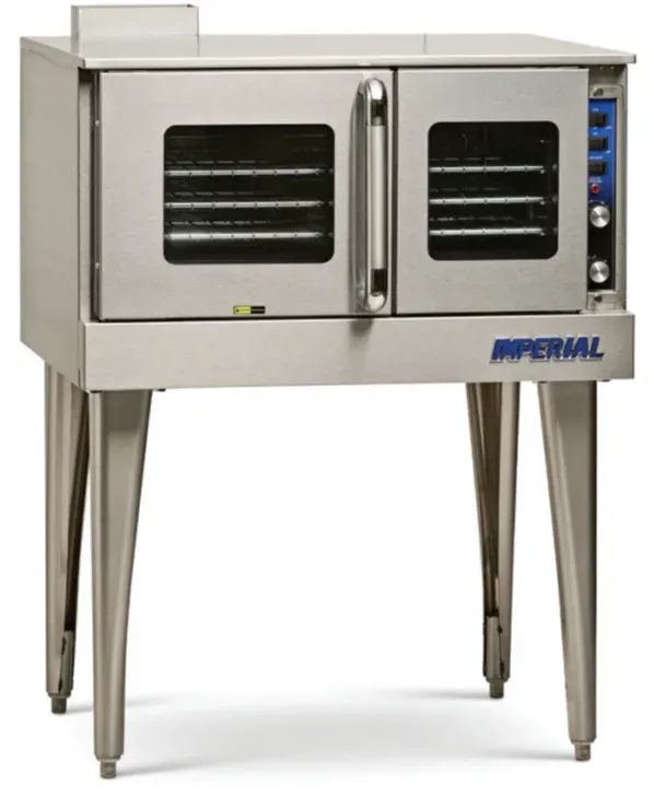 Optimize your kitchen efficiency with the Imperial PRV-1 Provection Oven. This single deck gas oven is designed to meet the demands of a commercial restaurant, offering exceptional performance and durability. The oven features an all stainless steel exterior, ensuring long-lasting use in a busy kitchen environment. Equipped with in shot burners and a 1/2 HP, 2-speed motor, this oven delivers powerful and consistent heat distribution for even cooking results. The highly sensitive Ametek thermostat control system allows precise temperature adjustments, while the cool down feature ensures safe handling after use. With five rack positions and three oven racks included, you have ample space to cook multiple dishes simultaneously. The oven door is equipped with tempered glass windows, allowing you to monitor the cooking process without opening the door. Additionally, the full porcelain interior makes cleaning a breeze. Stackable up to three units high, the Imperial PRV-1 Provection Oven offers versatility and can be used as a base for countertop units or built-in as part of Spec and Pro Series ranges. Available in both Natural and LP gas options, this oven is a reliable and efficient addition to any commercial kitchen.