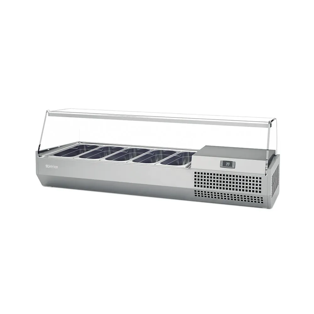 Elevate your pizza preparation with Infrico's Pizza Ingredient Display featuring a glass top and space for 5 pans. With a temperature range of 39°F to 41°F, this display unit is powered by a 1/6 HP compressor, drawing 1.82 Amps for efficient cooling.