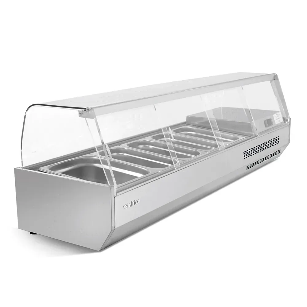 Optimize your pizza ingredient organization with Infrico's Pizza Ingredient Display featuring a glass top and space for 8 pans. This unit maintains a temperature range of 39°F to 41°F, driven by a 1/6 HP compressor drawing 1.82 Amps for efficient operation.