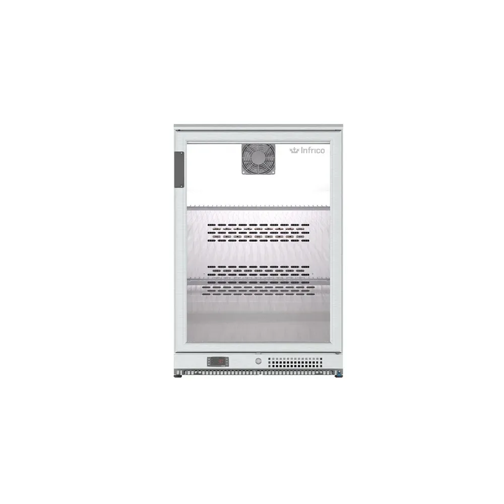 Infrico presents a Narrow Back Bar Cooler in black with 1 glass door, providing a sleek and modern aesthetic. With a temperature range of 39°F to 54°F, a 1/5 HP compressor, and drawing 3 Amps, this cooler adds a touch of sophistication to your bar area.