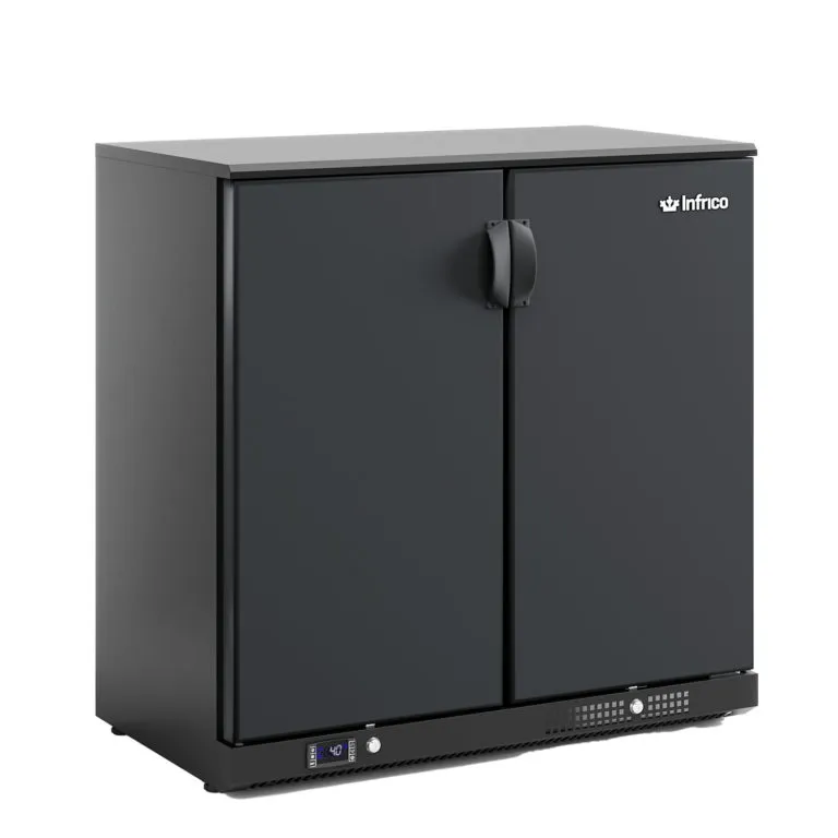 Elevate your bar area with Infrico's Narrow Back Bar Cooler in black, featuring 2 solid doors for organized drink storage. With a temperature range of 33°F to 38°F, a 1/5 HP compressor, and drawing 3.4 Amps, this cooler combines functionality with a modern aesthetic.