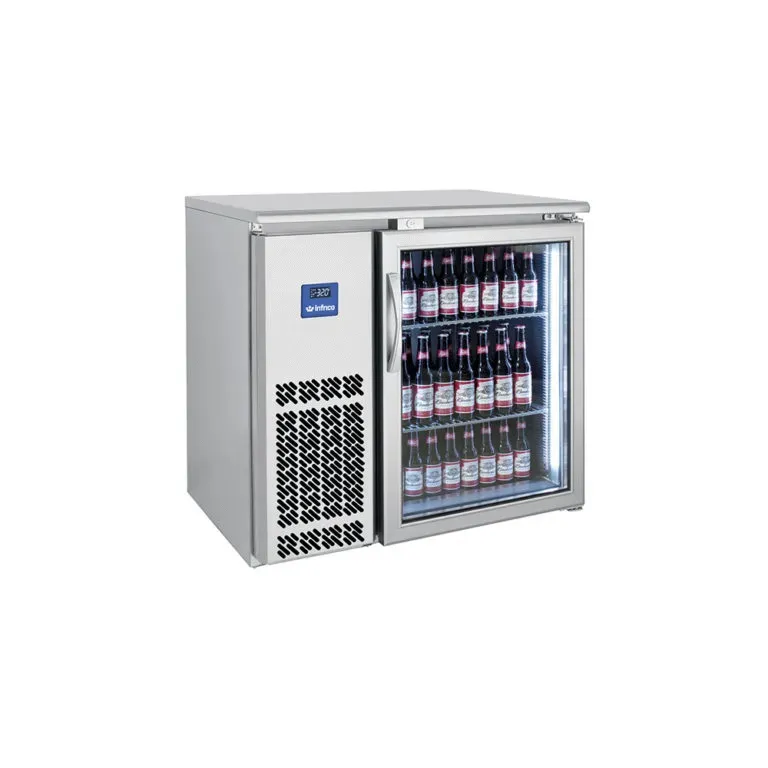 Infrico's Back Bar Cooler with 1 glass door provides a sleek and efficient solution for chilling beverages. Featuring a temperature range of 33°F to 38°F, a 1/5 HP compressor, and drawing 3.8 Amps, this cooler is perfect for bars and restaurants looking to showcase their drink offerings.