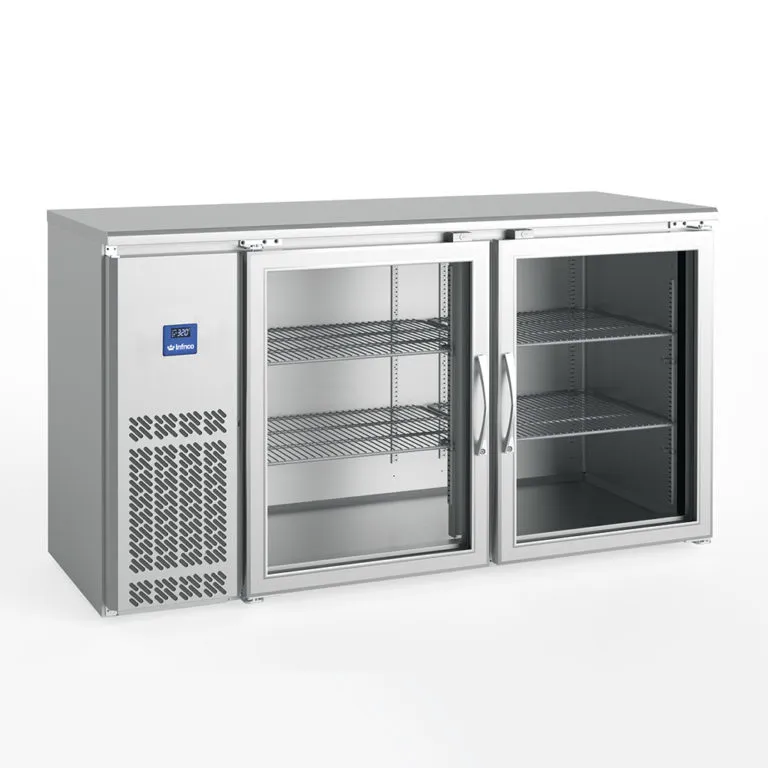 Elevate your beverage service with Infrico's Back Bar Cooler, featuring 2 glass doors for convenient access. With a temperature range of 33°F to 38°F, a 1/5 HP compressor, and drawing 5.2 Amps, this cooler combines functionality with a stylish design to enhance your bar area.