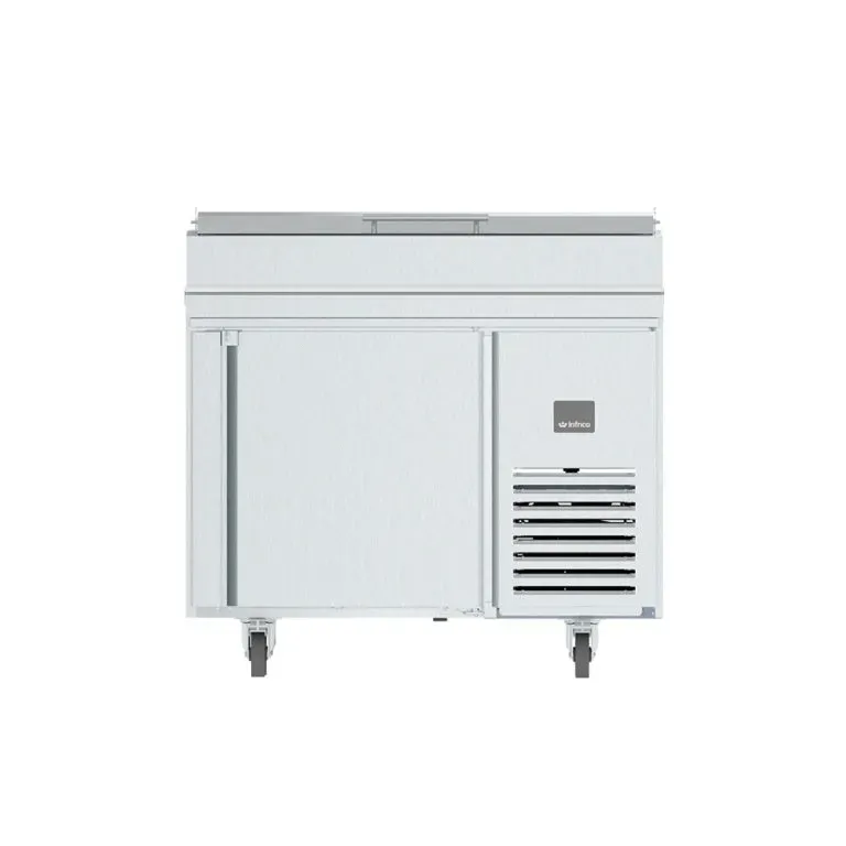 Infrico's 7.8ft Solid Door Refrigerator with 1 door for storage and 1 cutting board door is an ideal choice for pizzerias. With a temperature range of 35°F to 41°F, a 1/4 HP compressor, and drawing 4.1 Amps, this unit ensures your pizza ingredients are stored and prepared at optimal conditions.
