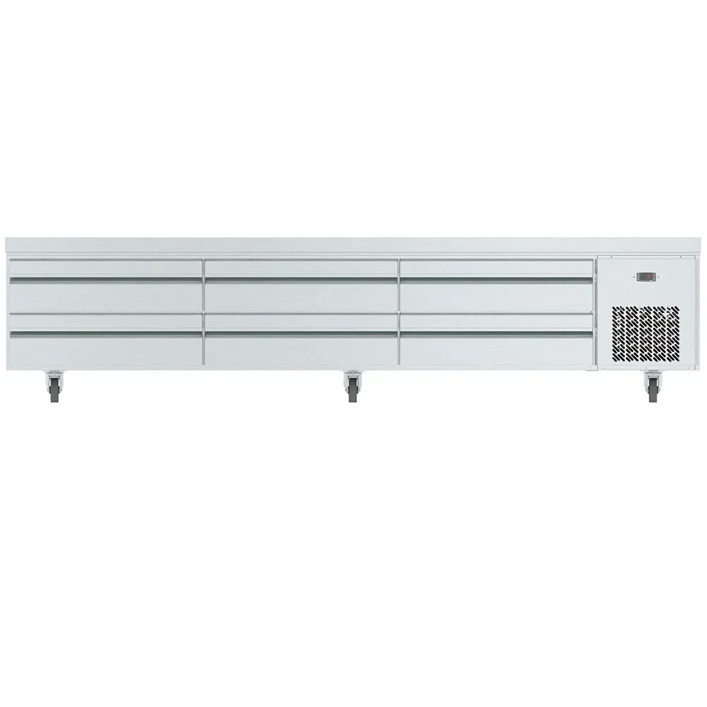Infrico's Chef Base with 6 drawers, capable of holding 12 pans, offers a spacious and efficient storage solution. Featuring 6 doors, a temperature range of 33°F to 38°F, a 1/3 HP compressor, and drawing 6.9 Amps, this unit ensures optimal conditions for your culinary needs.