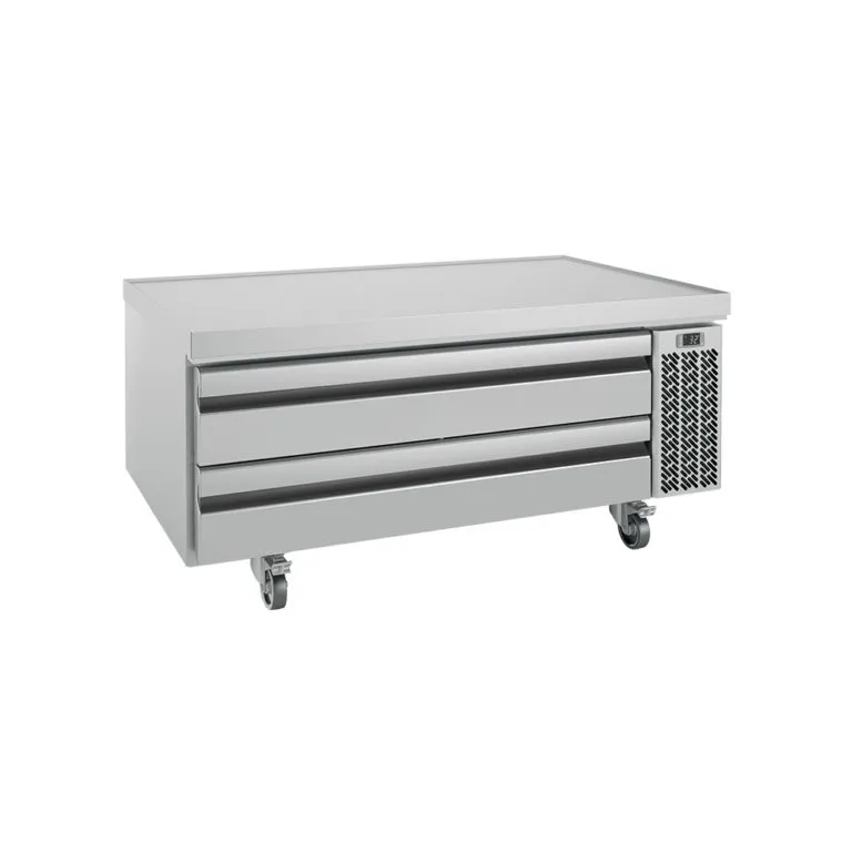 Infrico's Chef Base with 2 drawers, capable of holding 6 pans, provides a spacious and organized storage solution. Featuring 2 doors, a temperature range of 33°F to 38°F, a 1/3 HP compressor, and drawing 6.5 Amps, this unit ensures optimal conditions for your kitchen essentials.