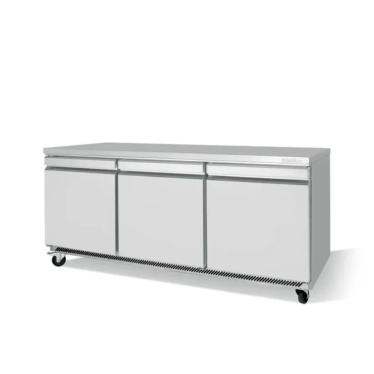 For increased storage capacity, Infrico offers a 21ft3 Solid Door Refrigerator with three doors. With a temperature range of 33°F to 38°F, a 1/3 HP compressor, and 4.6 Amps, this refrigerator provides ample space for perishable items while maintaining precise temperature control.