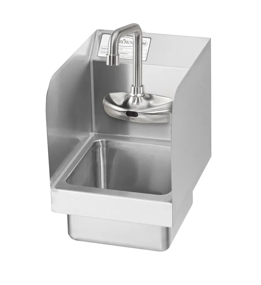 Upgrade your restaurant kitchen with the Krowne Metal HS-62 Hand Sink. This high-quality hand sink is designed to meet the demands of a busy commercial restaurant. With its 9" wide wall mount design, it provides ample space for handwashing, ensuring proper hygiene practices are followed. The satin 4" OC electronic faucet and 4-1/2" double bend spout make it easy to control water flow and temperature, while the side splashes help contain any splashes or spills. Whether you're running a small cafe or a large restaurant, this hand sink is a must-have for maintaining cleanliness and sanitation in your kitchen. Upgrade your restaurant kitchen today with the Krowne Metal HS-62 Hand Sink.