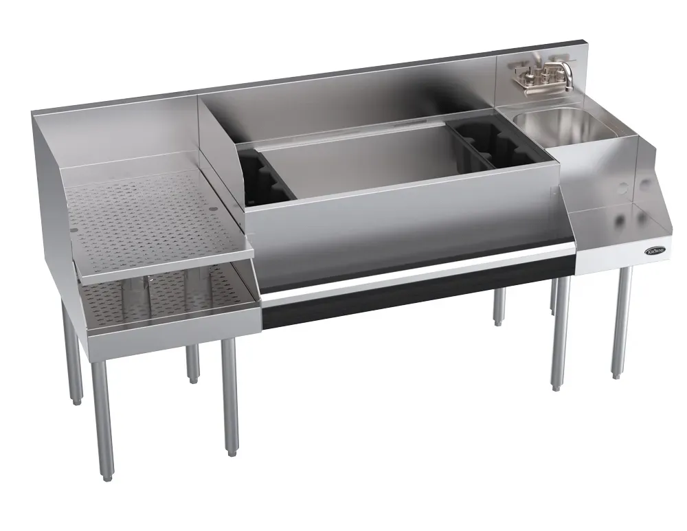 Take your kitchen to the next level with the Krowne Metal KR24-W66B-10 Workstation. This Royal Series 66" Recessed Drainboard/Ice Bin/Blender Workstation with Cold Plate is designed to enhance efficiency and functionality in a commercial restaurant setting. With its spacious 66"W x 24"D dimensions, this workstation provides ample space for food preparation, drink mixing, and storage. The recessed drainboard ensures easy cleanup, while the built-in ice bin keeps beverages chilled and ready to serve. The included blender workstation with a cold plate allows for quick and convenient blending of ingredients, perfect for creating refreshing cocktails or smoothies. Made by Krowne Metal, a trusted name in the industry, this workstation is built to last and withstand the demands of a busy restaurant environment. Upgrade your kitchen with the Krowne Metal KR24-W66B-10 Workstation and experience improved productivity and organization.