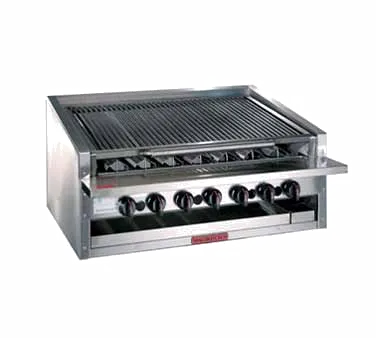 Unleash your kitchen's potential with the Magikitchn APM-RMB-648 Charbroiler. This countertop gas charbroiler is designed to meet the demands of a busy commercial restaurant. With a width of 48" and a height of 13", it provides ample cooking space for grilling a variety of meats and vegetables. The free-floating round rod top grate with EZ tilt to front grease trough ensures even heat distribution and easy cleaning. Made with stainless steel radiants and stainless steel on all sides, this charbroiler is built to withstand the rigors of a professional kitchen. It also features a 6" service shelf and a top grid scraper for added convenience. Whether you're grilling steaks, burgers, or kebabs, the Magikitchn APM-RMB-648 Charbroiler is the perfect addition to any commercial restaurant kitchen.