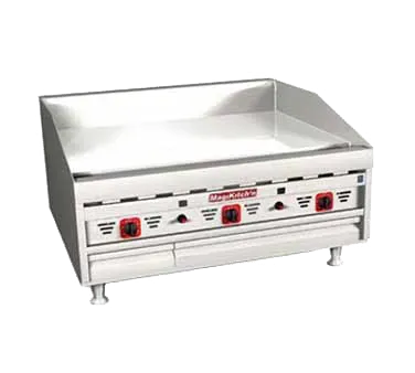Unleash gastronomic brilliance with the Magikitchn MKG-36-E Gas Countertop Griddle. This high-quality griddle is designed to meet the demands of a busy commercial restaurant kitchen. With a spacious 35-3/4" W x 24" D cooking surface, you'll have plenty of room to cook multiple dishes at once. The 1" thick polished griddle plate ensures even heat distribution for perfect results every time. The electric thermostat with matchless ignition allows for precise temperature control, while the grease chute and box, along with the front grease trough, make cleaning up a breeze. The 3" side splash helps contain any splatters, keeping your kitchen clean and safe. Made of durable stainless steel, this griddle is built to withstand the rigors of a commercial kitchen. With 90000 BTU of power, this griddle can handle any cooking task. Trust Magikitchn for all your commercial griddle needs.