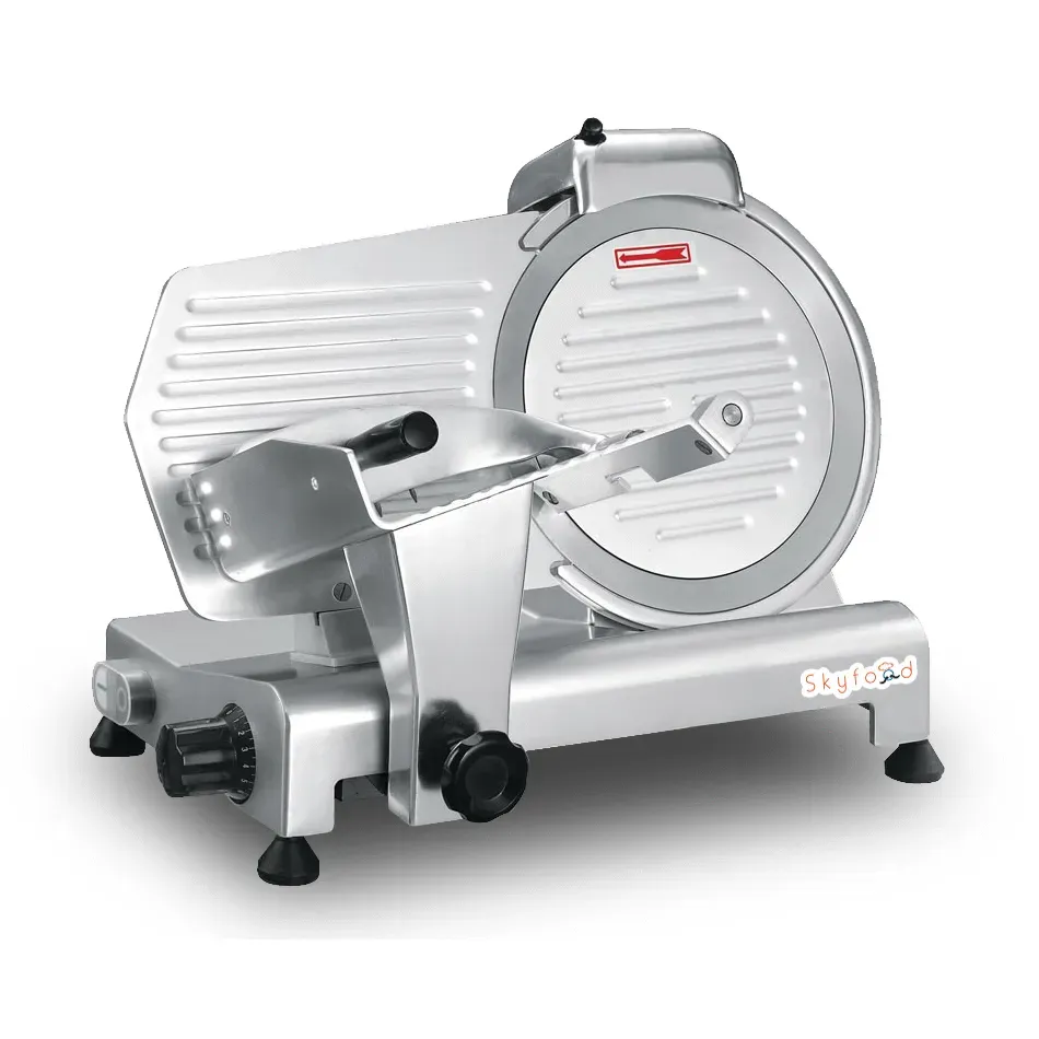 Enhance innovation with the Skyfood Equipment, 220E, Food Slicer, Electric. This compact and efficient slicer is designed to meet the needs of commercial restaurants. With its 9" diameter stainless steel blade and maximum slice thickness of 1/2", it effortlessly slices through a variety of ingredients, saving you time and effort in food preparation. The cast aluminum body with an anodized finish ensures durability and longevity, while the top-mounted sharpener keeps the blade in optimal condition for precise slicing. The safety rear ring guard and removable carriage provide added convenience and safety during operation. Additionally, the dual-action knife sharpener ensures that your blade remains sharp at all times. Powered by a 1/4 HP motor, this slicer is ETL and ETL-Sanitation certified, guaranteeing its reliability and compliance with industry standards. Upgrade your restaurant's slicing capabilities with the Skyfood Equipment, 220E, Food Slicer, Electric.
