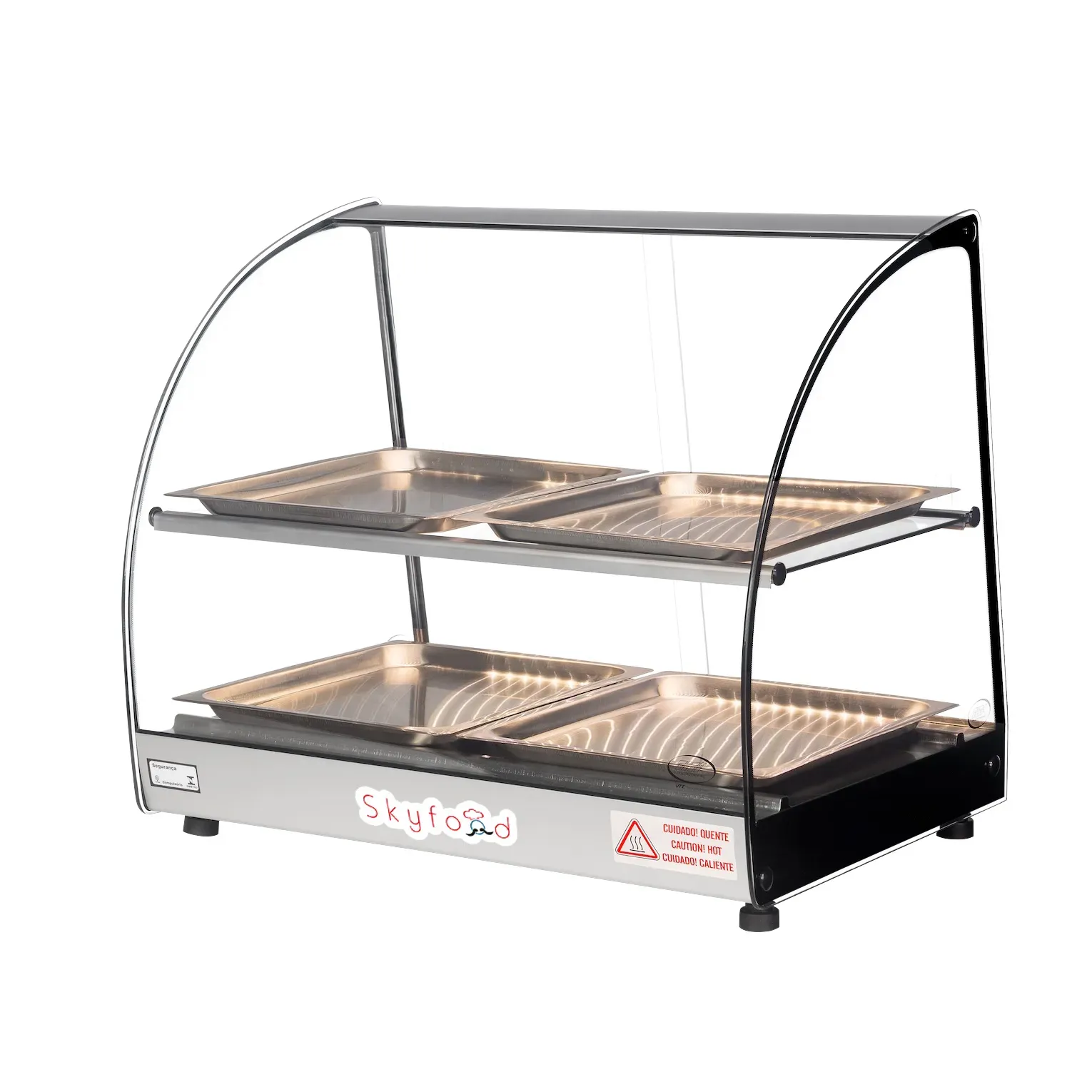 Ensure durability with the Skyfood Equipment FWD2-22-4P Display Case, Heated Deli, Countertop. This countertop food warmer display case is designed to withstand the demands of a commercial restaurant setting. With its stainless steel base and 304 stainless steel tubular heating element, this display case is built to last. The tempered curved front glass, tempered glass sides, and sliding rear doors not only provide a clear view of the food but also ensure easy access for serving. The LED lighting enhances the presentation of the food, making it even more enticing to customers. Equipped with a thermostat control, this display case allows you to maintain the perfect temperature for your deli items. Each shelf features two stainless steel pans, providing ample space to showcase a variety of dishes. Upgrade your restaurant's food display with the Skyfood Equipment FWD2-22-4P Display Case, Heated Deli, Countertop.