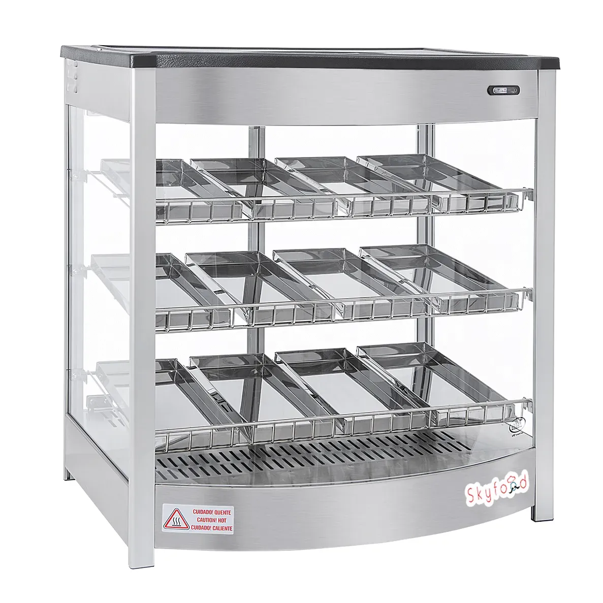Streamline operations with the Skyfood Equipment FWD3S12P Display Case, Heated Deli, Countertop. This versatile countertop food warmer display case is designed to enhance the efficiency of your commercial restaurant. With three adjustable nickel-plated shelves and four stainless steel pans per shelf, you can easily showcase a variety of delicious dishes. The tempered straight front glass, tempered glass sides, and hinged rear doors provide excellent visibility and accessibility for both customers and staff. The LED lighting illuminates your food, making it even more enticing to customers. The thermostatically controlled 304 stainless steel tubular heating element ensures precise temperature control, keeping your food at the perfect serving temperature. The aluminum frame and stainless steel base guarantee durability and longevity. With 1012 watts of power, this display case is a reliable and efficient addition to any restaurant.