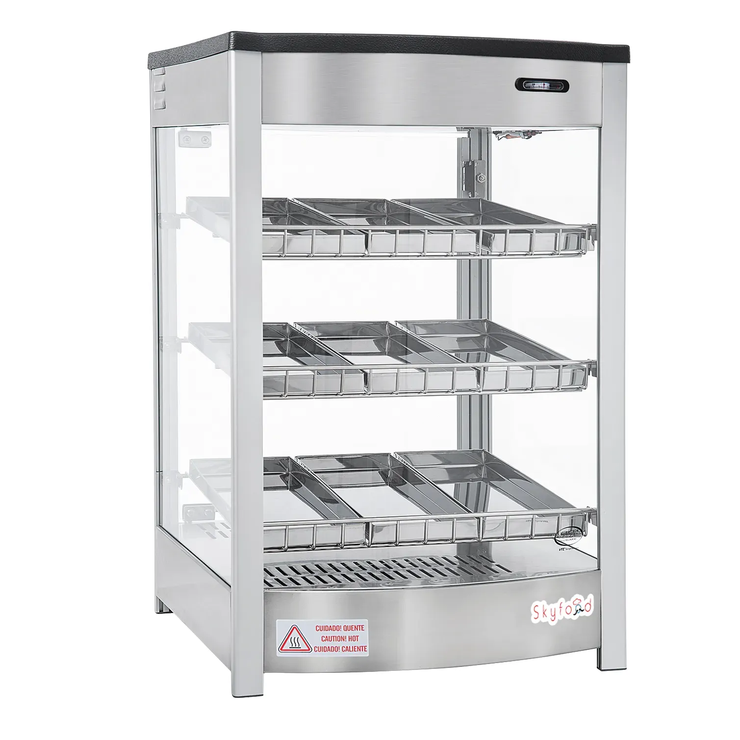 Ensure durability with the Skyfood Equipment FWD3S9P Display Case, Heated Deli, Countertop. This steam line food warmer display case is designed to meet the demands of a commercial restaurant setting. With its adjustable nickel plated shelves and stainless steel pans, you can easily showcase and keep your food warm and fresh. The tempered straight front glass, tempered glass sides, and hinged rear door provide easy access and visibility for your customers. The LED lighting adds an attractive display to your food items. The thermostatically controlled 304 stainless steel tubular heating element ensures precise temperature control. The aluminum frame and stainless steel base guarantee durability and longevity. Perfect for delis, cafes, and buffets, this display case is a reliable and efficient addition to any commercial kitchen. Trust Skyfood Equipment for all your restaurant equipment needs.